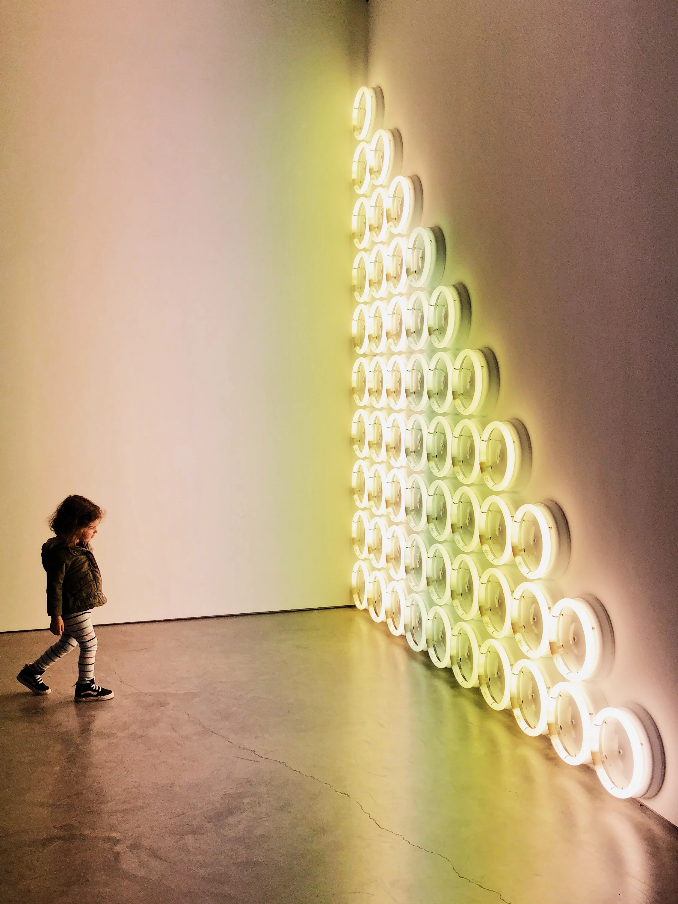 This girl was sitting in her stroller until her family pulled up in front of this Flavin. Once up on her legs, she strutted immediately towards the lights. I was lucky to snap this shot right before her grandmother came into the frame to prevent her from touching the installation. I get it girl, I want to touch the Flavin too.