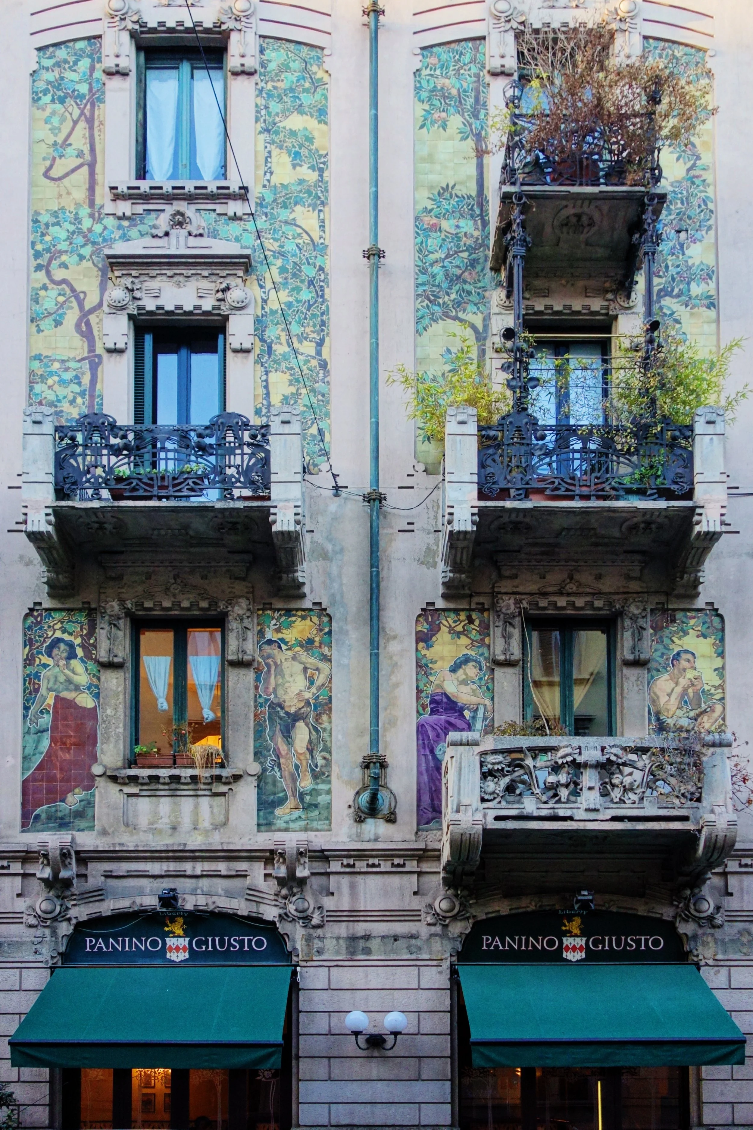 Hidden in Milan near Porta Venezia is an enclave of art nouveau (aka liberty style) buildings. One of the most notable examples is pictured here, the turn of the century palazzo Casa Galimberti. The exterior features a whimsical façade of feminine and masculine figures, curved wrought iron, a floral motif, and ceramic tiling. The nouveau exterior of Casa Galimberti actually stretches beyond this panel and wraps around the entire 170 meters of the palazzo. The building and the exterior were both designed and executed by architect Giovanni Battista Bossi between 1903-1906. While the city is known for it's flashier architecturural marvels like Boeri's Bosco Verticale, Pelli's Unicredito Tower, and the Galleria, this section of Milan has the air of cities like Brussels, Paris, Glasgow, and Barcelona, where Art Nouveau is much more common.